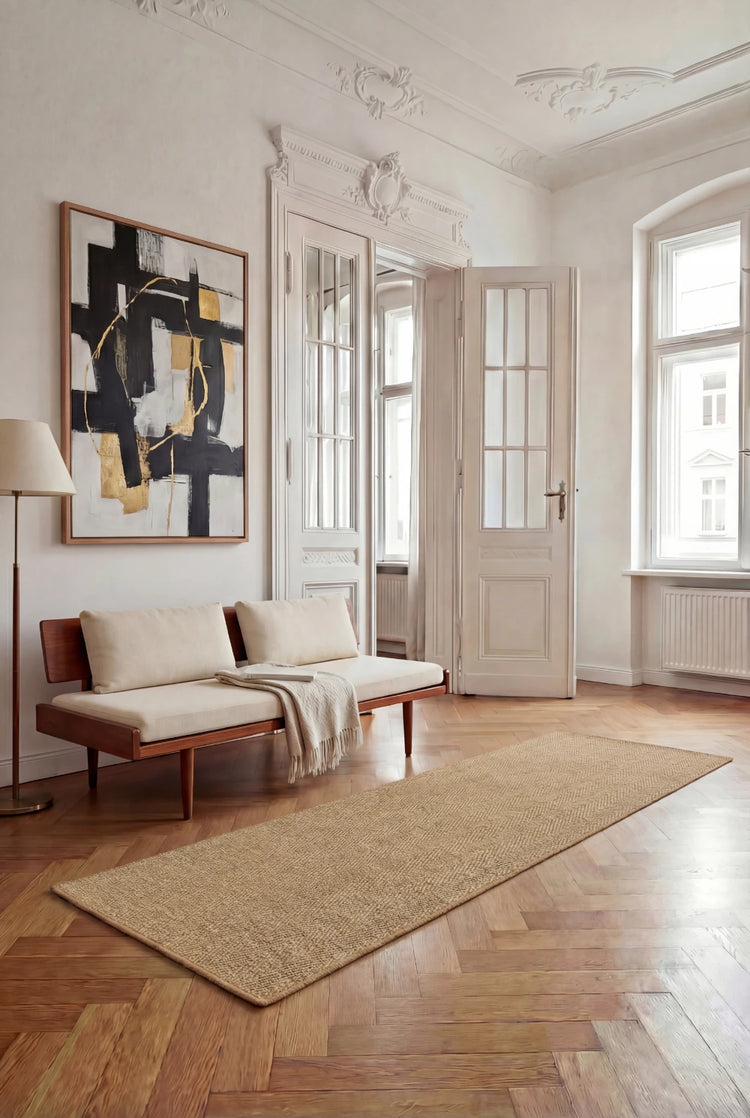 This sisal carpet runner perfectly combines functionality and aesthetics. Crafted from the natural fibers of the sisal agave and woven in a classic herringbone weave, it offers numerous advantages. It provides increased slip resistance, reduces footfall noise, and improves walking comfort on hard floors. As a stair runner, it protects the wood or natural stone of your steps and minimizes the risk of slipping. The sisal runner regulates the indoor climate by absorbing and releasing moisture – ideal for historic buildings and people sensitive to the weather. In addition to its practicality, it impresses with its natural appearance, which perfectly complements country-style, Art Nouveau, or modern interiors.